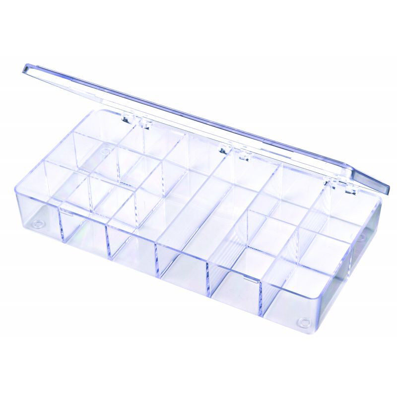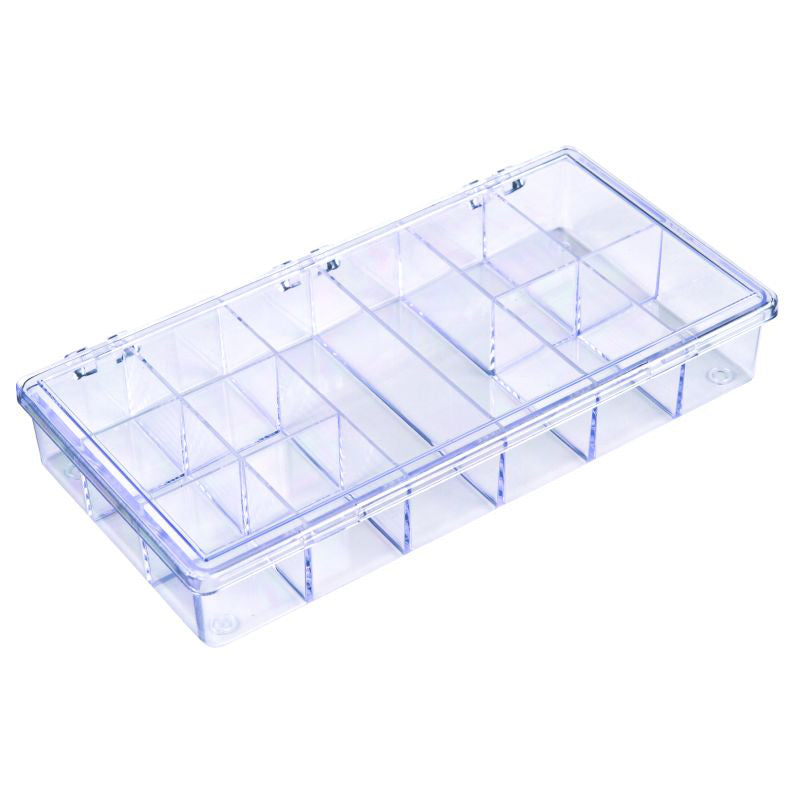 8" x 4" x 1 3/16" (20.32 x 10.16 x 3.02 cm) A-Series 6610CB (A201) twelve compartment box with hinged lid has a distinct stout look with square corners and true 90° walls. Still a popular pick with customers from many industries. From crafts to electronics and more, these crystal clear containers offer easy access and are great for organized storage.