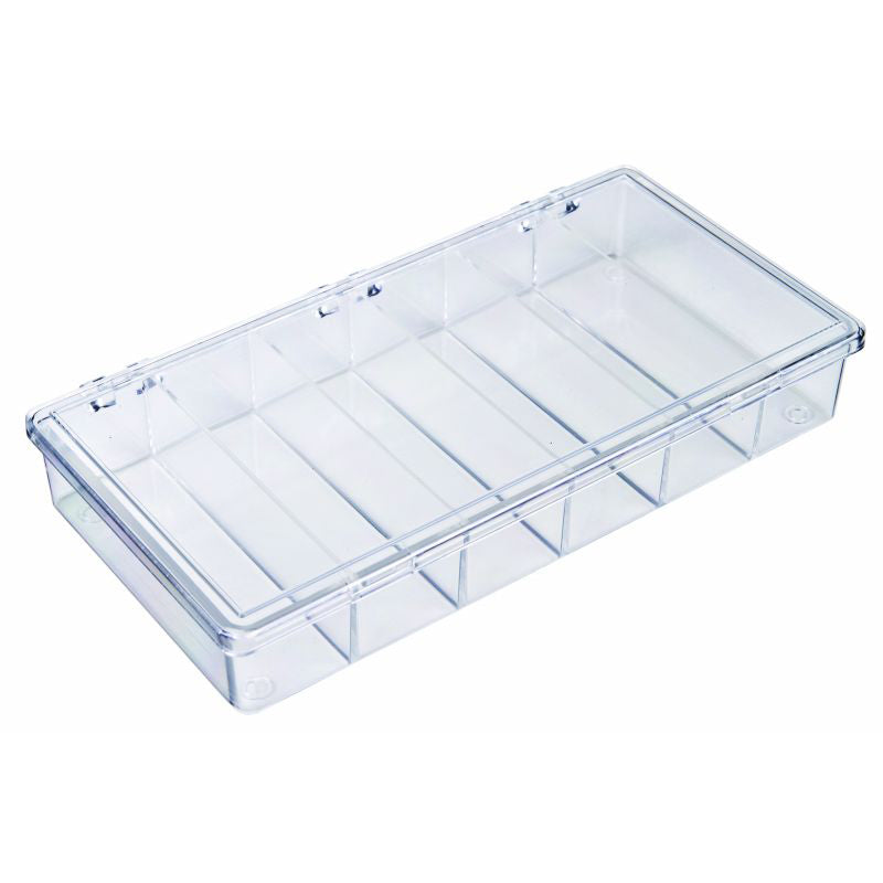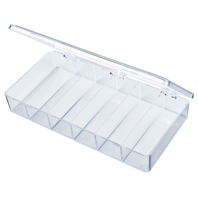 8" x 4" x 1 3/16" (20.32 x 10.16 x 3.02 cm) A-Series 6612CB (A203) six compartment box with hinged lid has a distinct stout look with square corners and true 90° walls. Still a popular pick with customers from many industries. From crafts to electronics and more, these crystal clear containers offer easy access and are great for organized storage.