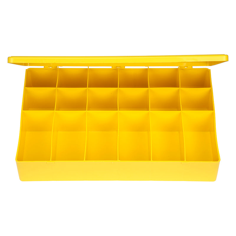 M-Series 6724TF (M818) eighteen compartment box has extra heavy-duty construction making this safety yellow in color polypropylene box tough and durable. The M-Series compartment box is a workhorse featuring a heavy-duty, heat-sealed hinge and overlapping lid to inhibit dust. Impervious to most household chemicals, solvents, oil and gasoline, this box keeps items safe and organized.