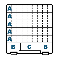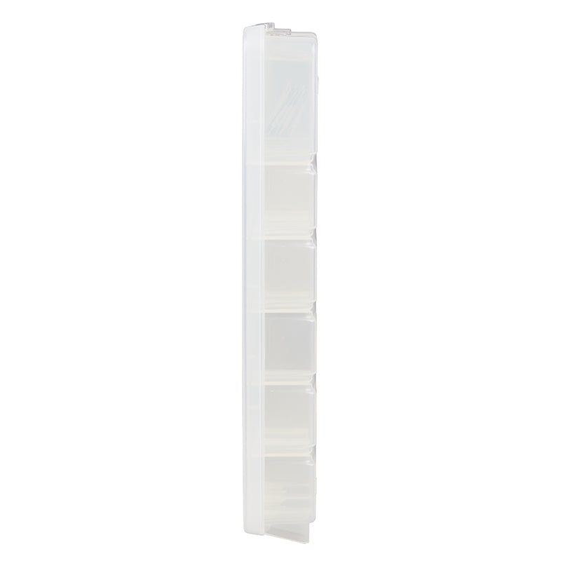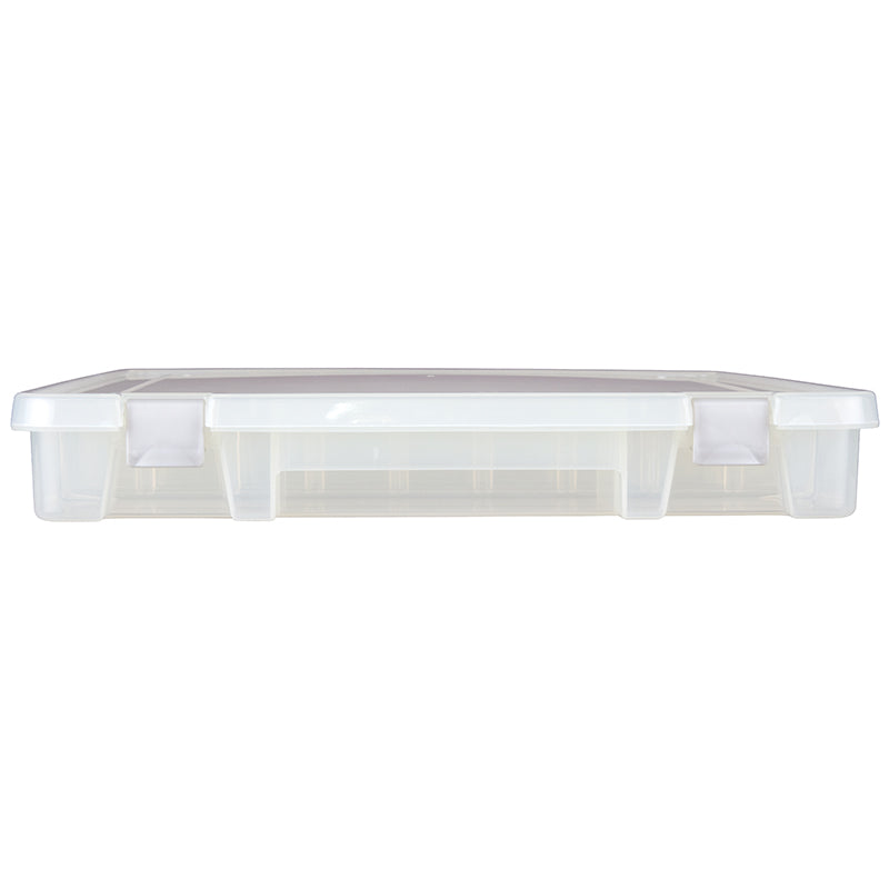 The 13 1/8" x 13 1/8" x 1 3/4" (33.34 x 33.34 x 4.45 cm) eight-compartment Slim Super Satchel 6999TE (T9101AT) includes 20 removable anti-tarnish dividers. It is stackable and made from acid-free polypropylene.