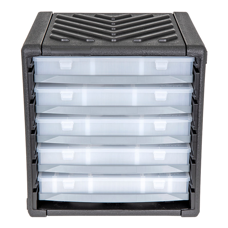 The 15 1/4" x 14 3/4" x 16" (13.34 x 37.47 x 40.64 cm) Infinite Divider Storage (IDS) System cabinet has interlocking grooves that allow for easy, secure stacking. The cabinet can serve as both mobile and stationary storage and includes five 6725ID (T900) IDS translucent boxes with dividers that can be placed every 0.0625" (0.16 cm) throughout the fixed partitions. Each box fits into its own tray within the cabinet and can be quickly removed from the cabinet while the parts inside remain secure. IDS cabinets feature a dent-proof polypropylene housing.