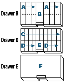 The 6763BD (2275-2) includes the following drawers: (2) Drawer B - Includes six removable dividers per drawer, (2) Drawer D, and (1) Drawer E.